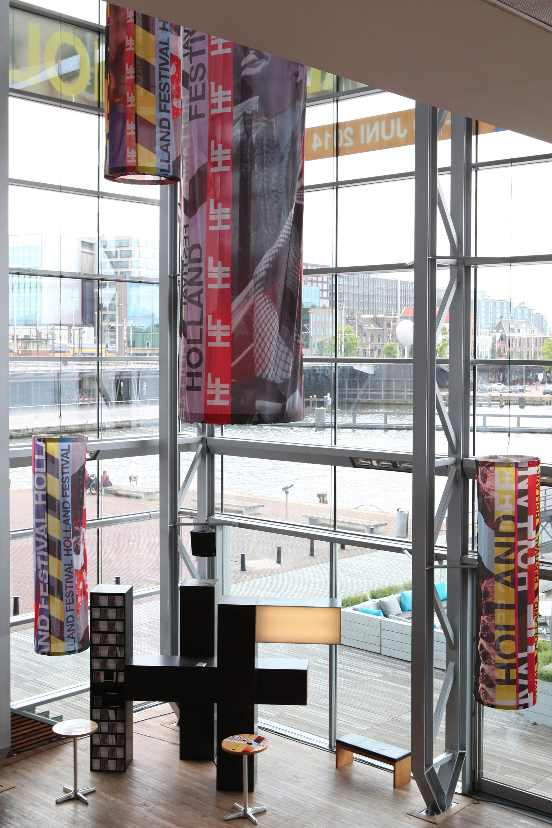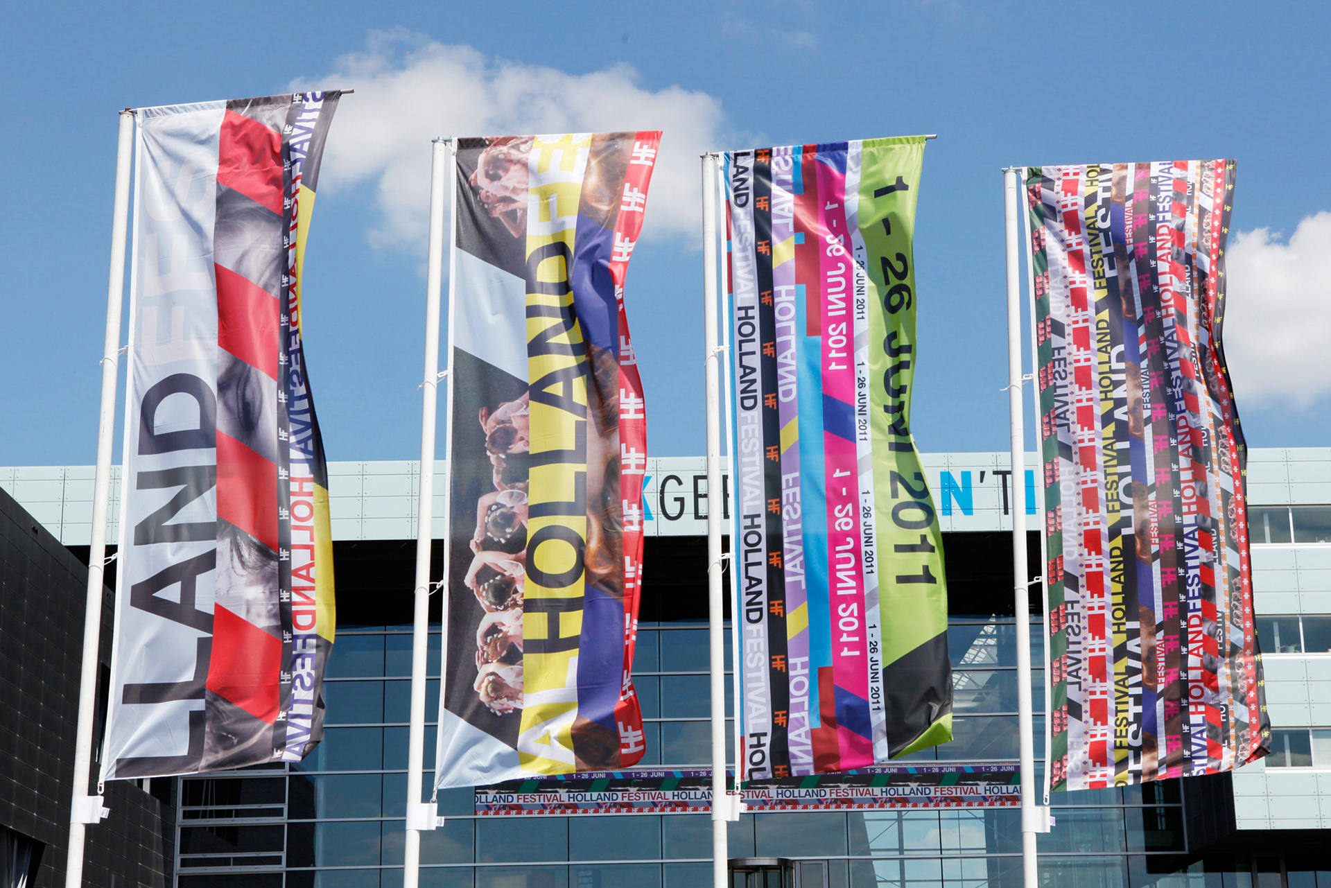 Festival design / City Dressing for the Holland Festival in Amsterdam. Studio VollaersZwart is responsible for the city dressing of the HOLLAND FESTIVAL. The festival design is communicated on the facades and interiors of its venues, using coloured tapes, banners and flags. The design recycles typography and logos from previous festivals. Last year, clothes were made using flags from the previous festival.