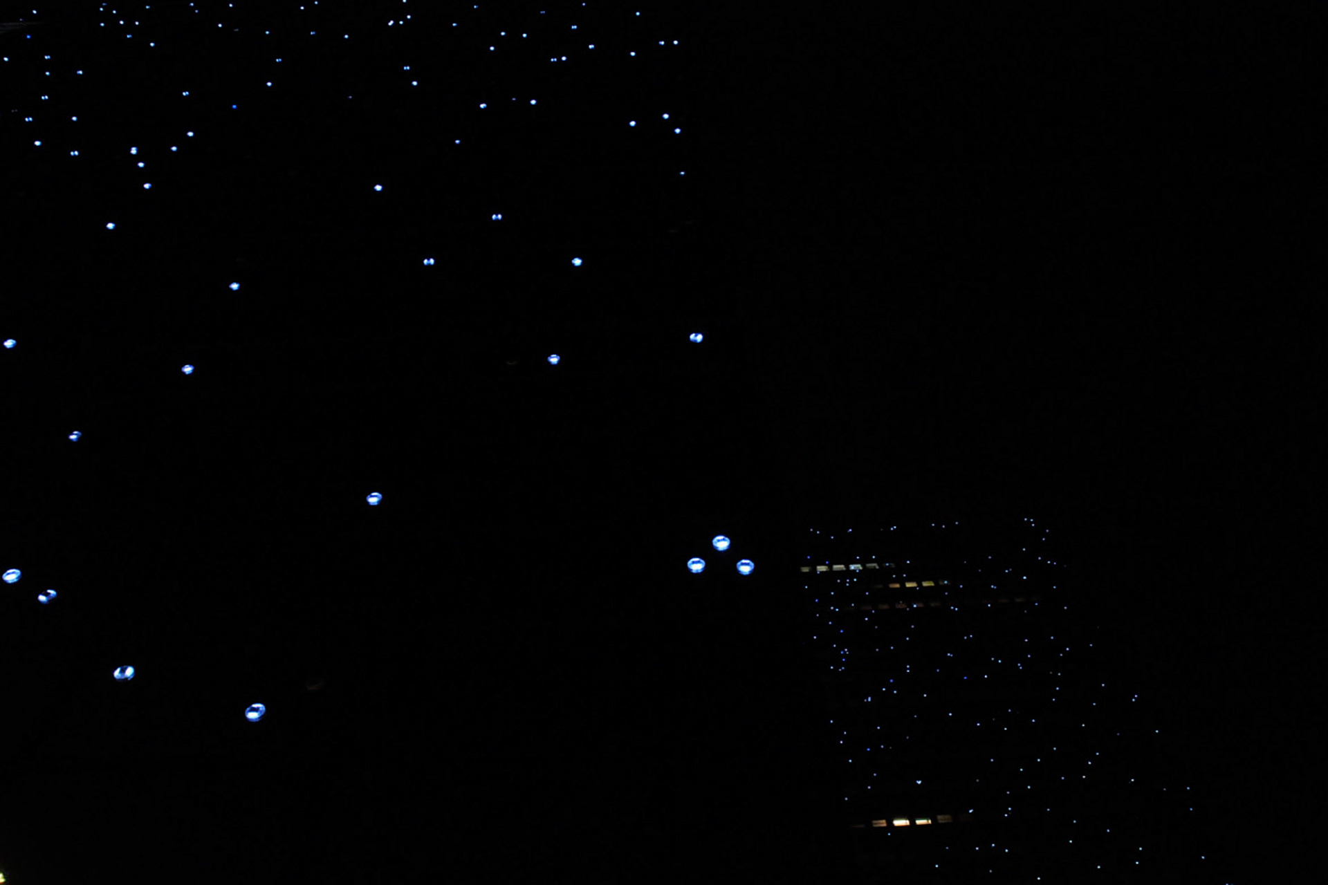 STARS is a light sculpture by studio VOLLAERSZWART, sparkling in the nocturnal Rotterdam skyline. By day, STARS is barely visible, yet by night, STARS creates an artificial starry sky. The Delftse Poort, a 150m high building housing the Nationale Nederlanden offices, was randomly covered with thousands of blinking LED-lights. The lights random appearance gives them a natural appearance in the night sky. This monumental light sculpture functions without need for electricity. The durable LED-lights are charged during daylight via on-board solar cells, and remain lit for eight hours at night blinking at 4 different speeds.